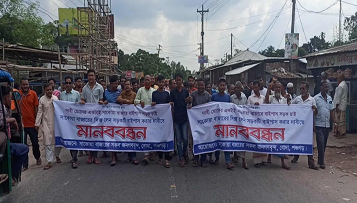 পঞ্চগড়ের বোদা উপজেলায় ৬ লেন সড়ক নির্মাণে ব্যবসা প্রতিষ্ঠান না ভেঙে বাইপাস সড়ক নির্মাণের দাবিতে ব্যবসায়ীদের মানববন্ধন ও বিক্ষোভ মিছিল অনুষ্ঠিত হয়েছে। বুধবার (২৪ সেপ্টেম্বর) দুপুরে উপজেলার সাকোয়া বাজার এলাকায় সাকোয়া বাজারের সকল জনগণের ব্যানারে বোদা-দেবীগঞ্জ মহাসড়কের পাশে দাড়িয়ে ঘন্টাব্যাপী মানববন্ধন অনুষ্ঠিত হয়। পরে একটি বিক্ষোভ মিছিল বের করা হয়। মিছিলটি প্রধান সড়ক প্রদক্ষিণ করে একই এলাকায় গিয়ে শেষ হয়।