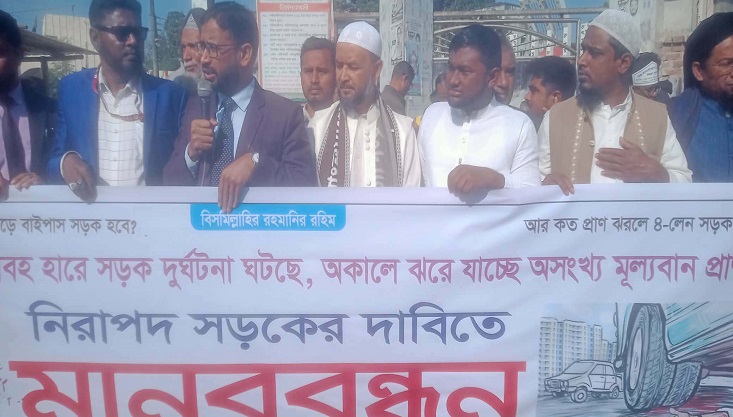 পঞ্চগড় শহরের উপর দিয়ে সকাল থেকে বিকেল পর্যন্ত ট্রাক চলাচল বন্ধ, অবিলম্বে ৪ লেন সড়কের কাজ শুরু করতে, নিরাপদ সড়কের দাবিতে মানববন্ধন কর্মসূচি পালন করা হয়েছে।